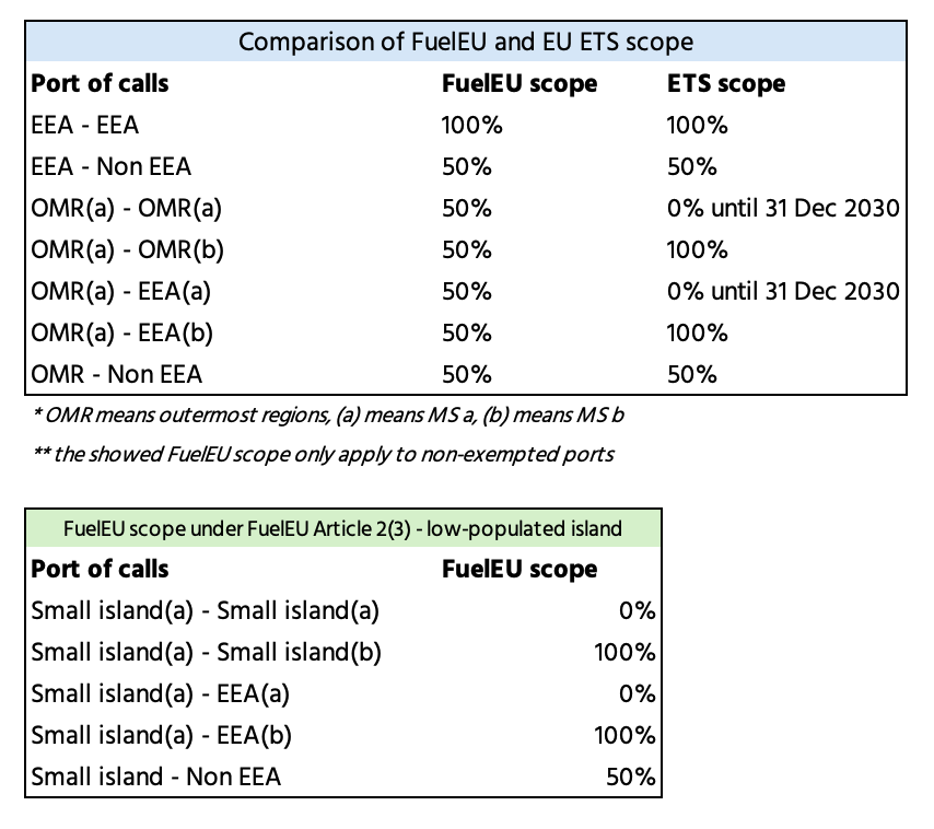 - The report also clarifies the FuelEU and Emissions Trading System (ETS) scope for different cases of international voyages. Details are provided in the table below.